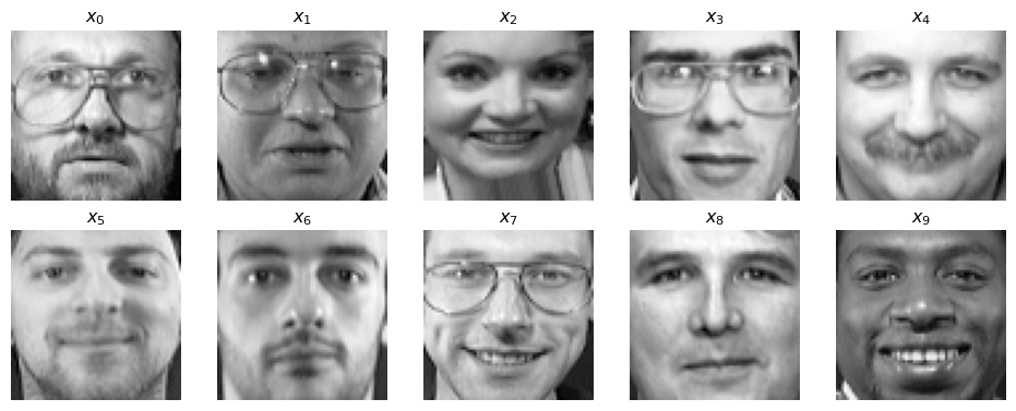 Each grayscale face image of size {64 \times 64} is flattened into a vector \mathbf{x} of size {4096 \times 1}. So, \mathbf{x}^{(i)} are samples from the joint distribution of the random vector \mathbf{X}.