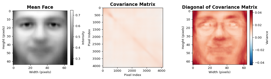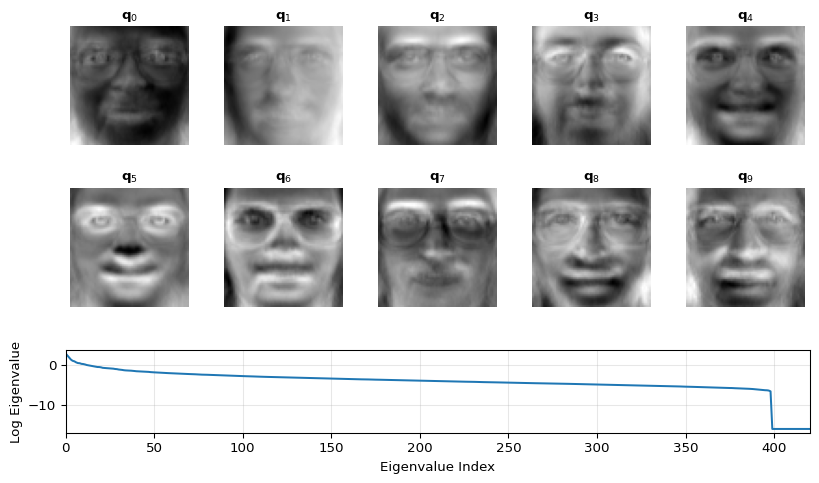 An eigendecomposition \mathbf{C}_{\mathbf{XX}} = \mathbf{Q} \mathbf{\Lambda} \mathbf{Q}^H yields eigenvectors \mathbf{Q} = [\mathbf{q}_1, \dots, \mathbf{q}_N], the eigenfaces, and eigenvalues \mathbf{\Lambda} representing the variance captured by each component.