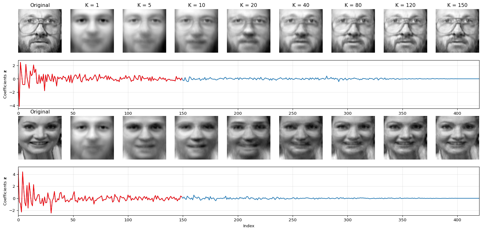 Using the Discrete Karhunen-Loéve Transform (DKLT), the face images can be compressed for storage or transmission. Each face \mathbf{x} is represented in the eigenface basis and can be reconstructed partly (K \ll M) \mathbf{z} = \mathbf{Q}^H (\mathbf{x} - \mathbf{m}), \quad \hat{\mathbf{x}} = \mathbf{m} + \sum_{k=1}^{K} z_k \mathbf{q}_k