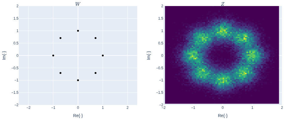 The phase shift key is modeled by Z = W + N, where W = \exp(jK) with K \sim U[0,1,\dots,M-1] and N as complex-valued noise, for example, Gaussian.
