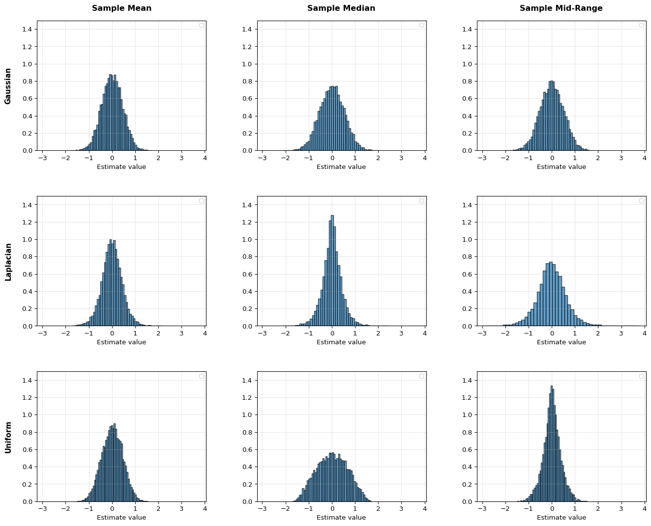 To evaluate the estimators, we can assume a probability distribution X, from which those samples x_i originated. Let’s consider three scenarios: a Gaussian distribution, a Laplacian distribution, and a Uniform distribution, all three with unknown parameters (and their mean).
