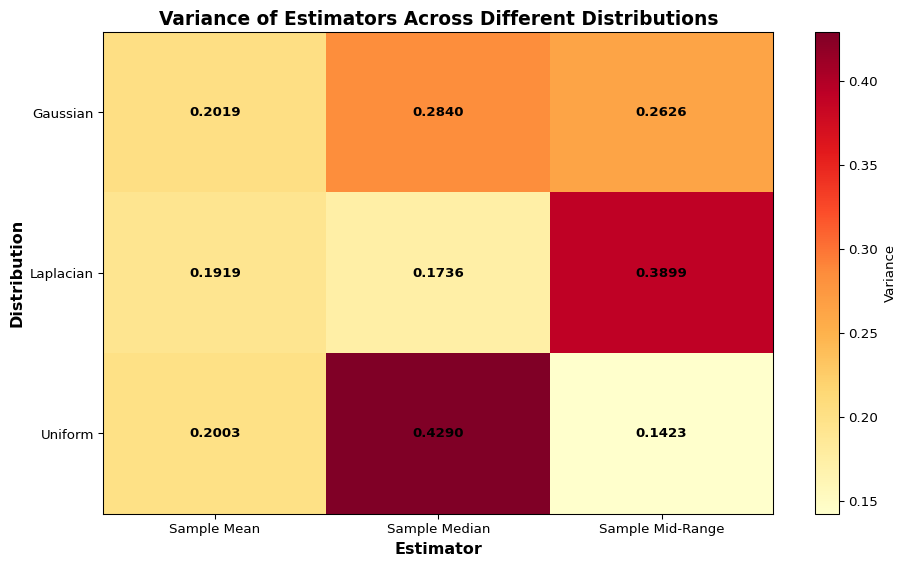 As seen in the graphs, all estimators are unbiased regardless of the distribution as they are symmetric around the true value. However, the variances are vastly different. The sample mean has the same variance across all distributions; however, we see that each distribution has a clearly winning estimator with smallest variance.