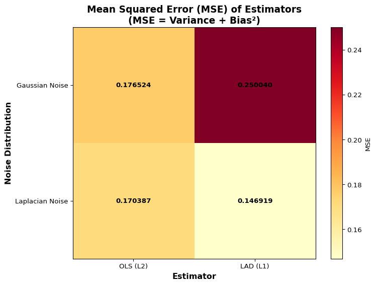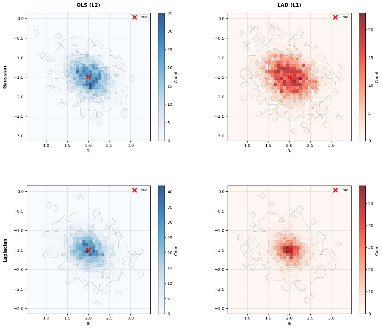 The example uses N=15 observations per trial and \sigma_v=1.0 noise level. With Laplacian noise, the heavier tails create outliers where LAD’s robustness shows its advantage over OLS.