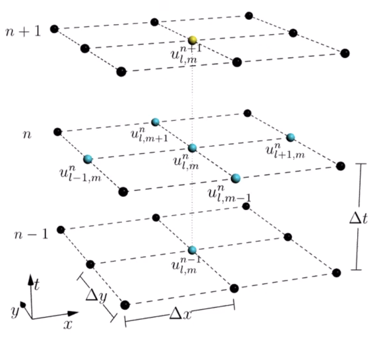 FDTD solves the wave equation numerically on a grid (instead of the analytic mode solution). For the 2D case, \frac{1}{c^2}\frac{\partial^2 u}{\partial t^2} = \frac{\partial^2 u}{\partial x^2} + \frac{\partial^2 u}{\partial y^2}, we sample the sound pressure field u(x, y, t) on a lattice: u_{l,m}^n \approx u(n\Delta t,\, l\Delta x,\, m\Delta y) and replace derivatives by finite differences. This gives \frac{u_{l,m}^{n+1}-2u_{l,m}^{n}+u_{l,m}^{n-1}}{(c\Delta t)^2} = \frac{u_{l+1,m}^{n}-2u_{l,m}^{n}+u_{l-1,m}^{n}}{(\Delta x)^2} \;+\; \frac{u_{l,m+1}^{n}-2u_{l,m}^{n}+u_{l,m-1}^{n}}{(\Delta y)^2}.