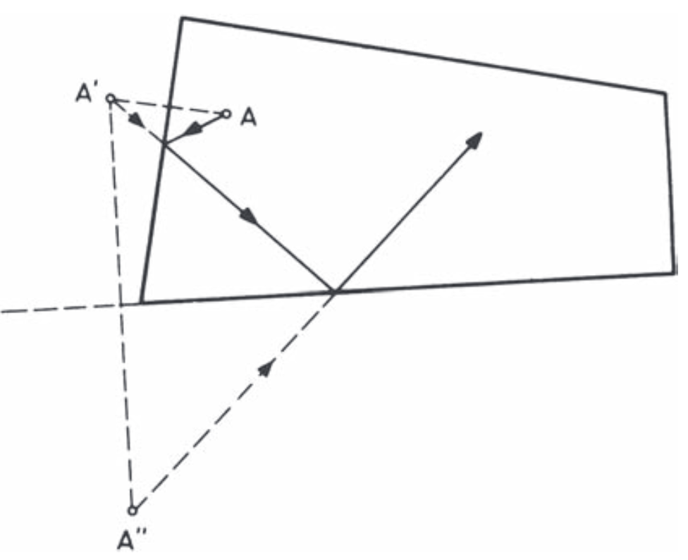 Instead of tracing rays as they reflect off walls, the image method creates virtual image sources by mirroring the real source across each wall. The path from an image source to the listener corresponds to a reflection path in the real room.