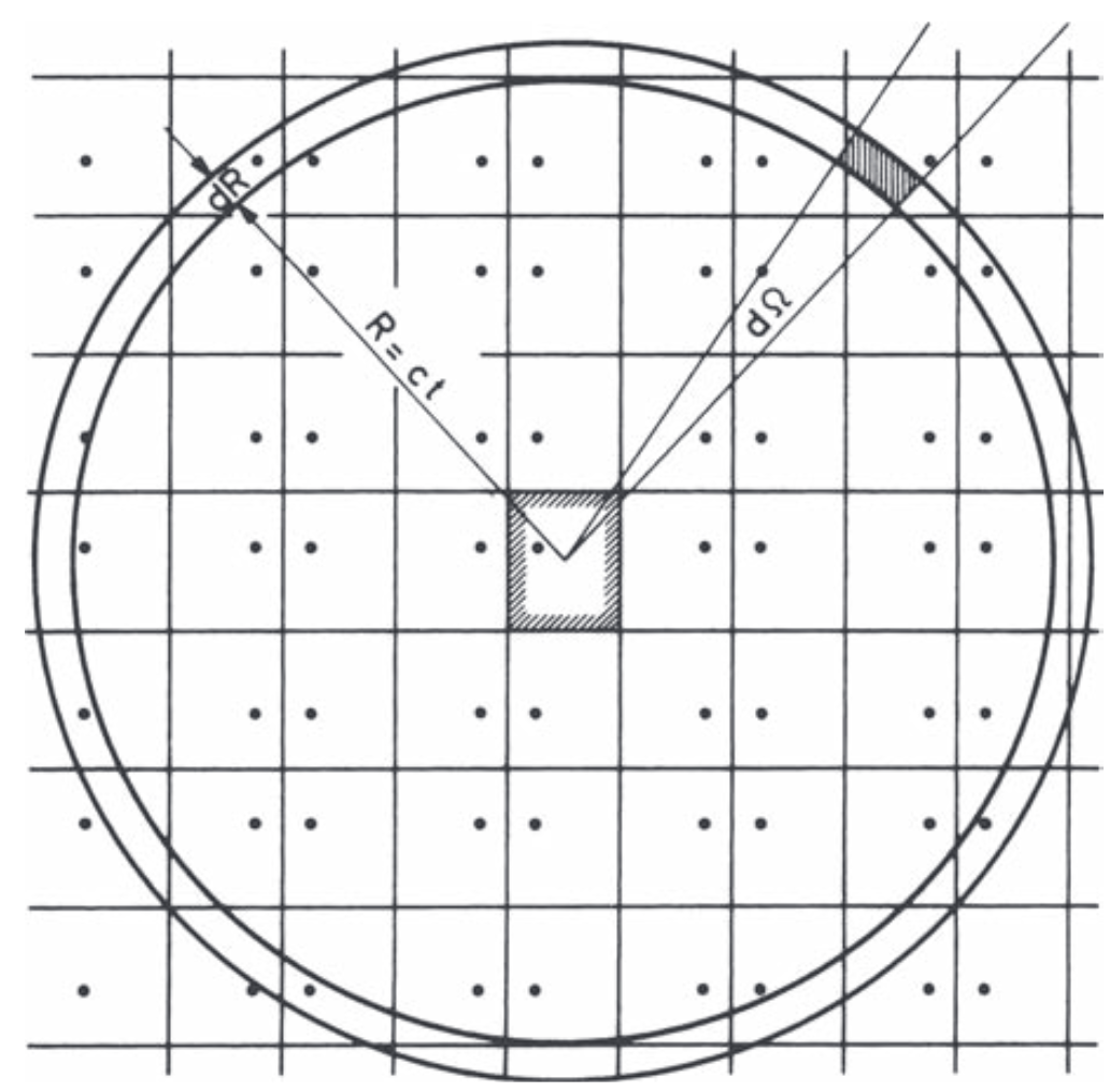 As time evolves, the number of contributing image sources grows rapidly because reflections from more distant mirrored rooms arrive later. Each additional reflection order adds a new “shell” of image rooms in a 3D lattice, so the count of images up to order N grows roughly like O(N^3), see Figure 5.1. If we treat image sources as a uniform lattice with one image per room volume V, then the expected number of images within a propagation radius r = c\,t is proportional to the volume of a sphere: N(t) \approx \frac{\frac{4\pi}{3}(c\,t)^3}{V} \quad .