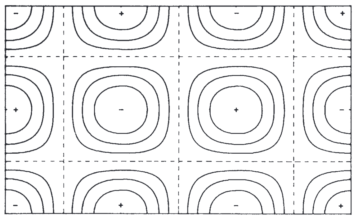 The indices (n_x, n_y, n_z) label standing‑wave room modes and their spatial patterns in a rectangular room. The figure below shows one such mode shape in the plane z=0.