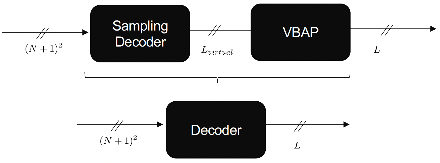 Different decoder algorithms can be used for loudspeaker playback. The choice of decoder impacts energy distribution, localization accuracy, and robustness to irregular loudspeaker layouts. In the labs you will compare these strategies qualitatively and observe how order and array geometry influence the results.