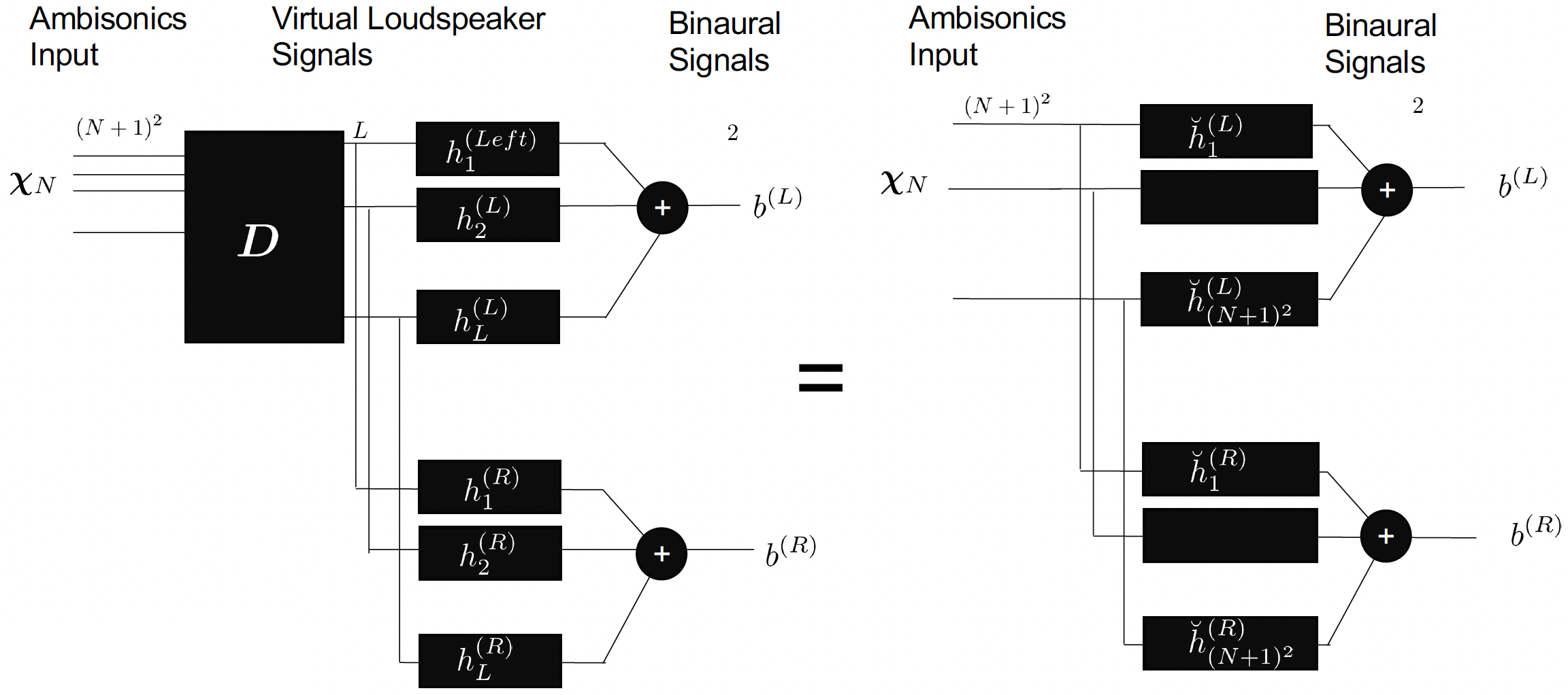 For headphones, we use head‑related impulse responses (HRIRs) to recreate directional cues. The key idea is that each Ambisonics component is filtered and summed to form the left and right ear signals.