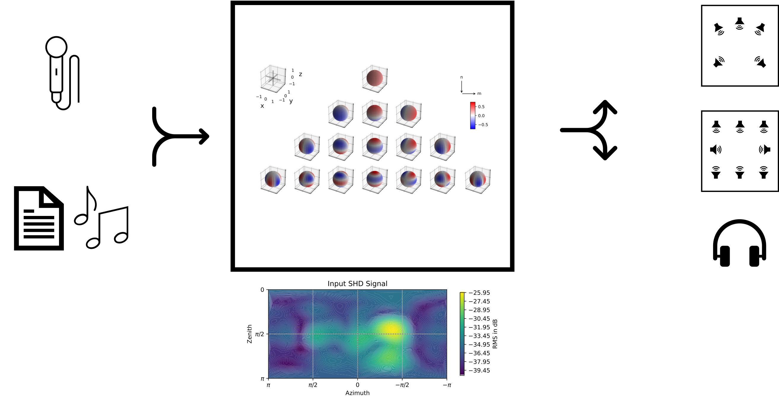 - Ambisonics encoding: Representing sound sources as spherical harmonic coefficients