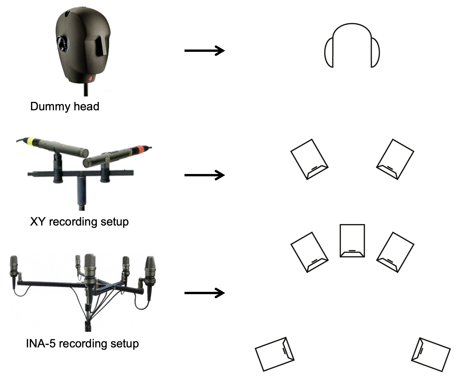 The figure shows a direct progression from capture method to playback format: a dummy‑head recording maps naturally to headphone listening, an XY stereo pair maps to a conventional two‑speaker setup, and a multichannel array like INA‑5 maps to larger loudspeaker layouts. The key point is that traditional recordings are tightly coupled to a specific playback configuration, which limits flexibility when the listening setup changes. Ambisonics breaks that link by capturing the sound field itself, so you can decode later to headphones, stereo, or multi‑speaker arrays without re‑recording.